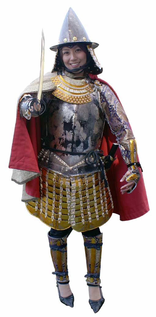 織田信長の甲冑を着て、その上に朱色の外套(カパ)をまとった姿